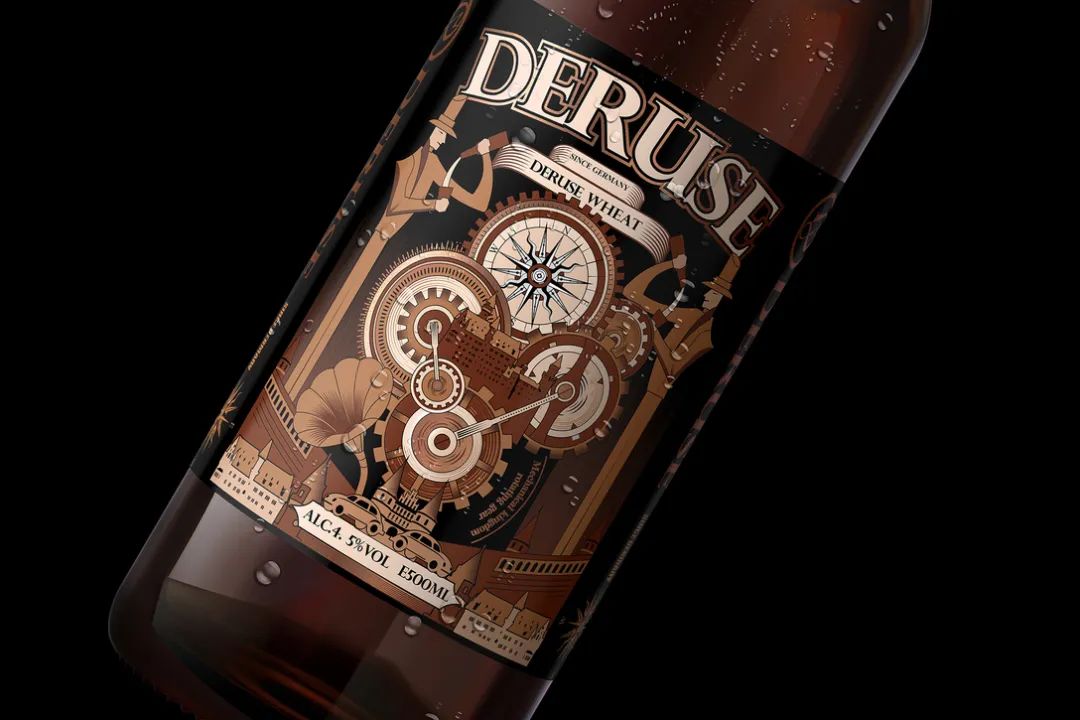 设计采用德式经典元素符号——齿轮、时钟、甲壳虫等以插图艺术来诠释德式的属性。具有古典形象的德国男士、德国古堡、古典音乐留光机共同营造了精酿啤酒文化与浪漫优雅的格调。